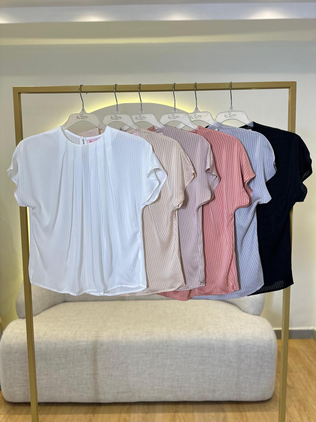 Blusa feminina confeccionada em tecido leve e fluido, com acabamento levemente acetinado. Possui modelagem solta e detalhe de pregas verticais na parte frontal, que criam um caimento elegante e sofisticado. As mangas curtas e o decote redondo conferem um visual delicado e versátil, ideal para composições tanto formais quanto casuais. A cor em tom nude traz neutralidade e sofisticação, facilitando combinações com diversas peças do guarda-roupa.