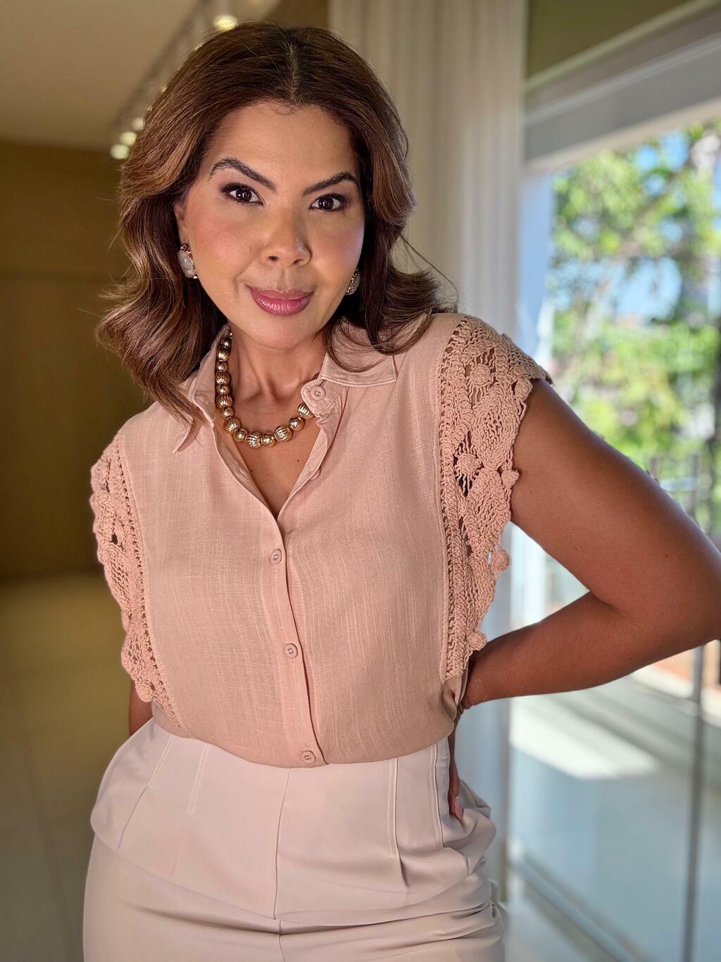 Blusa em tecido leve, com gola de camisa e fechamento por botões frontais. O grande destaque está nas mangas curtas trabalhadas em renda, que adicionam romantismo e delicadeza ao visual. Uma peça elegante e fresca, perfeita para looks casuais chic ou produções mais sofisticadas.