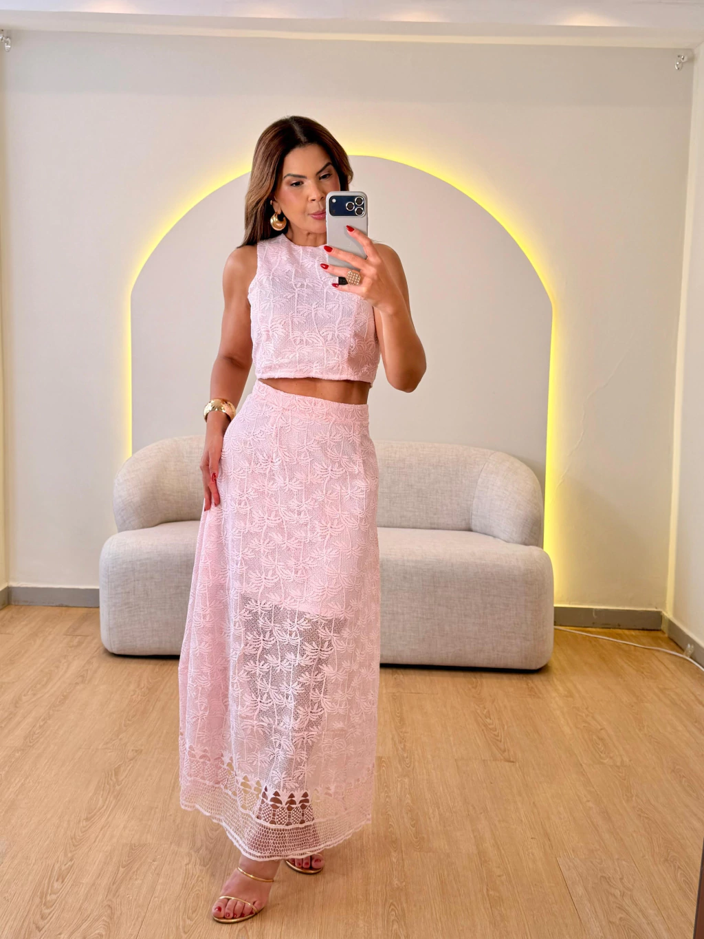 Apresenta um conjunto de duas peças , cropped e uma saia, ambos feitos do mesmo tecido texturizado. O tecido é notavelmente trabalhado com uma renda ou bordado guipir em relevo, que cria um padrão intrincado e repetitivo, possivelmente motivos florais ou, mais distintamente, folhas de palmeira ou coqueiro estilizadas por toda a superfície. A natureza dessa textura confere um aspecto romântico e boho-chic ao conjunto. Cropped com uma modelagem básica e moderna. Apresenta um decote arredondado ou em U suave na frente e é sem mangas ou com alças largas que cobrem os ombros. A parte de trás não é visível, mas a frente parece ter um corte reto na altura da cintura ou logo abaixo do busto. O cropped utiliza o mesmo tecido rendado, mas devido ao seu corte mais estruturado, o tecido não apresenta tanta fluidez como a saia. A saia é longa, de comprimento midi ou maxi, e segue a mesma textura rendada e padrão de palmeiras. O modelo levemente evasê, ajustando-se à cintura e caindo de forma vertical. A parte mais baixa da saia exibe um acabamento de barra em renda de bordas recortadas ou com um desenho diferenciado que finaliza a peça de maneira delicada.