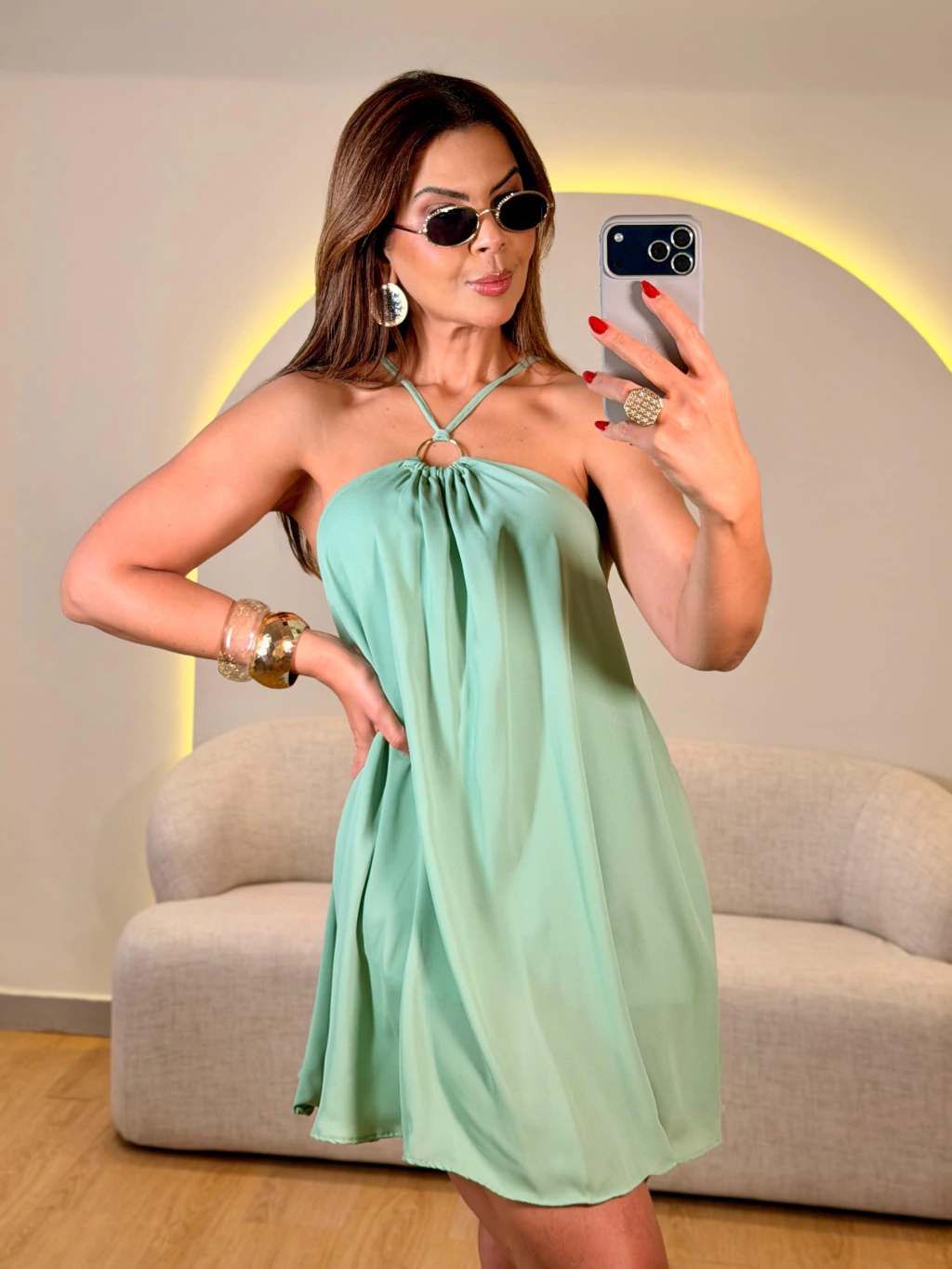 A peça é um vestido com uma modelagem incomum e fluida que se assemelha a um top halter. A característica mais marcante é o decote, que é franzido e preso por uma argola metálica dourada ou acobreada no centro da parte frontal superior. Desse ponto de argola, saem alças finas e duplas (tipo espaguete), que se cruzam ou se amarram, projetando-se para o pescoço e as costas, sustentando o peso da peça. O tecido é leve, fino e maleável, caindo em pregas e drapeados verticais a partir da argola, o que confere à peça um caimento solto e amplo sobre o corpo. A barra da peça não é reta, apresentando um formato suavemente arredondado e irregular, que adiciona movimento à silhueta.
