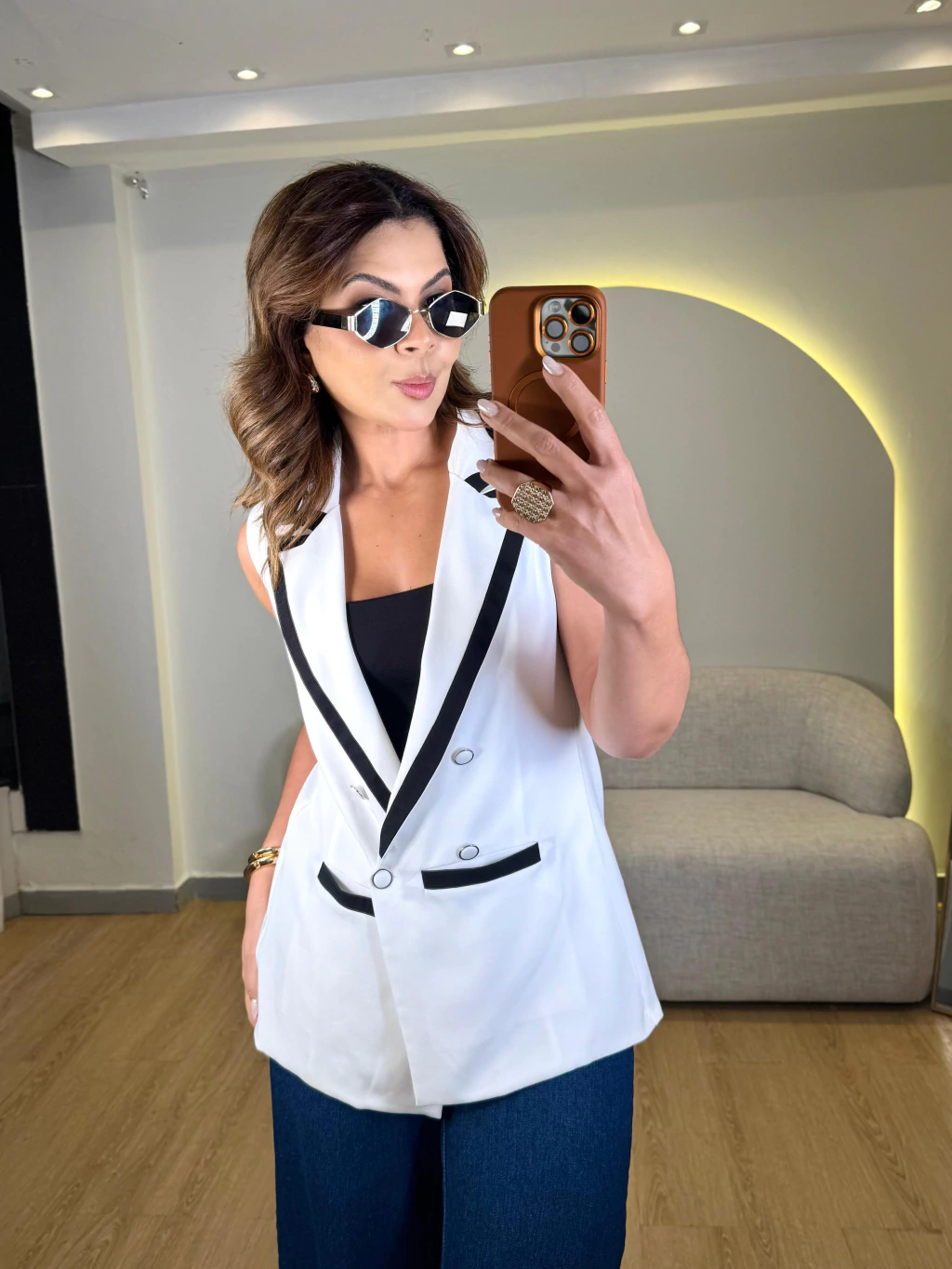 Colete alfaiataria sem mangas, com modelagem alongada e acabamento elegante. Possui lapela e bolsos decorativos com recortes contrastantes, além de botões frontais metálicos que adicionam um toque moderno e sofisticado. Peça versátil e estilosa, perfeita para compor looks casuais ou sociais com um ar de elegância.