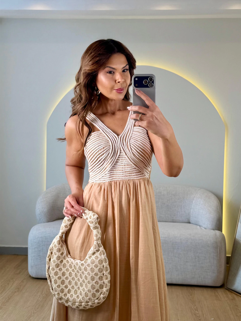 Um modelo longo que combina uma saia fluida com um busto detalhado por cordões trançados, que formam um desenho simétrico e estruturado nas alças e no decote. Tendo alças em detalhes V e zíper nas costas.